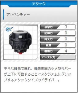 「平らな軸先で暴れ、軸先周囲のツメ型ラバーが上下に可動することでスタジアムにグリップするアタックタイプのドライバー。」