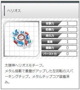 「太陽神ヘリオスモチーフ。メタル搭載で重量がアップした左回転のスパーキングチップ。メタルチップコア装着済み。」